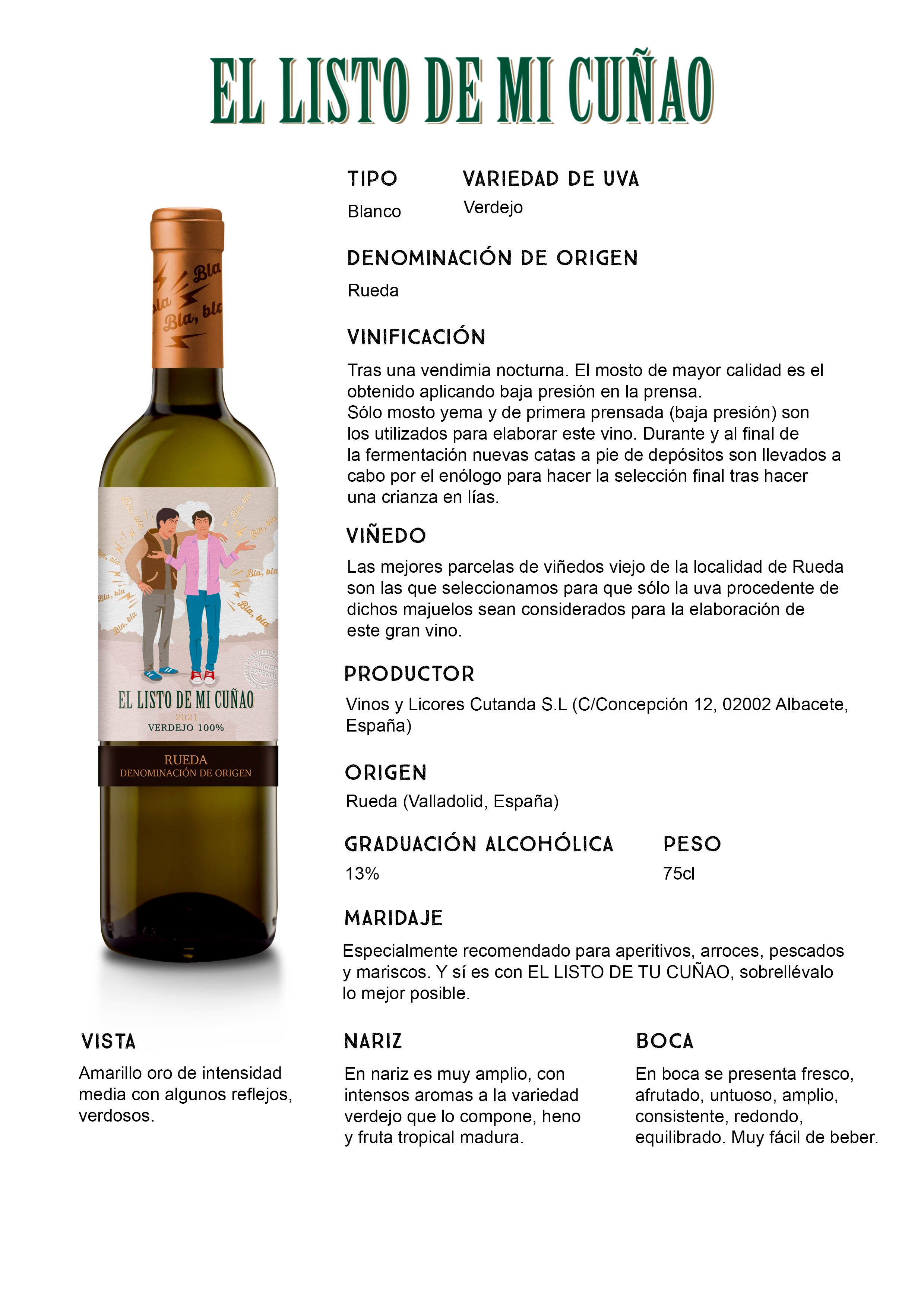 El Listo de Mi Cuñao procede de suelos vallisoletanos, buena parte de ellas de cepas centenarias. La alta edad de las viñas aporta a este vino una gran complejidad de aromas y una buena estructura. Su nariz herbácea y tropical y su final en boca largo y refrescante hacen de él el blanco ideal para acompañar platos de pasta, mariscos y pescados.